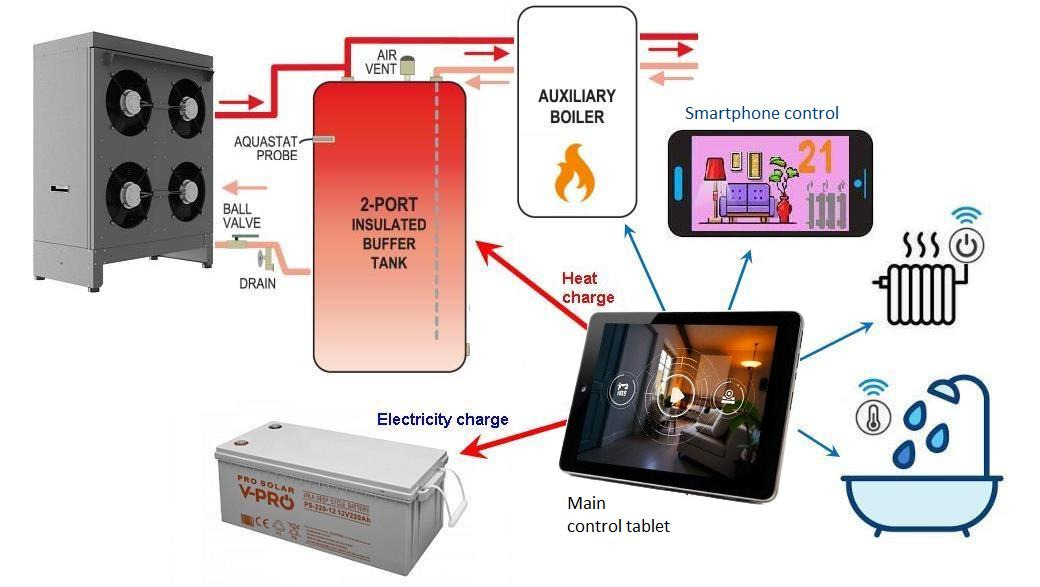 Our program controls heat charging in the water tank when electricity cheaper, and weather conditions are better for HP operation, and uses charged heat energy when electricity tariffs are higher or weather conditions are bad.