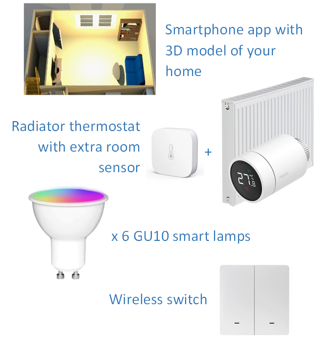 We develop a program for you: 3D model of your home and a convenient menu for managing your room (rooms) from smartphone. Any changes in design as you like. We use modern development tools, and the design takes little time (about a day for one room).